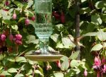 This year I have a new humming bird feeder. It was an on-line order and came from a place that specializes in bird and humming bird feeders. It's a charming antique style bottle that hangs upside down. It screws into a covered feeder tray dish with 4 metal flower feeder ports. They said it was bee and bug proof. It doesn't drip either. So I filled it and it's been hanging for 3 days. Today I went up to the plant hook to add a hanging plant and realized the bottle was just about empty!!! My other cute little glass feeder was never emptied. It always had bees at it and the ants would get to it as well. The mix would go bad and have to be changed. But the little hummers cleaned out this new bottle lickety split! Impressive. This is going to be fun.